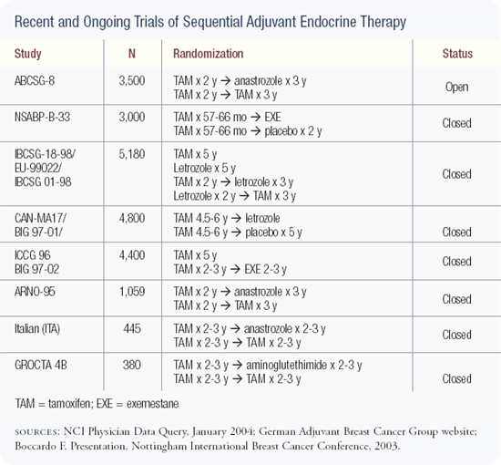 The whole issue of the timing, duration and sequencing of antiestrogen strategies is very interesting, and everyone is looking forward to the results of the Breast International Group/FemaraR-Tamoxifen (BIG/FEMTA) study. This large European trial has four arms: (1) five years of an aromatase inhibitor, (2) five years of tamoxifen, (3) two years of tamoxifen followed by three years of an aromatase inhibitor, and (4) two years of an aromatase inhibitor followed by three years of tamoxifen.
