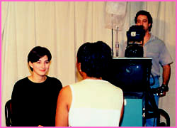 Finkelstein, MD, (left) interviews a breast cancer survivor for