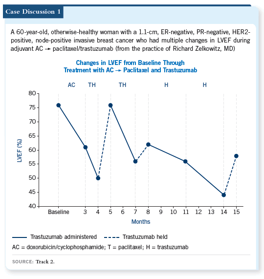 Her ECHO in June showed an LVEF of 55 percent, and she had ongoing problems with pleural effusions. In September, the ECHO showed an ejection fraction of 65 percent. She said, “Can’t I have more trastuzumab?” I said, “No.”