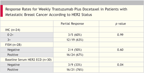 “Weekly administration of docetaxel and trastuzumab is safe and effective for patients with metastatic breast cancer whose tumors overexpress HER-2. Further research is warranted to determine the value of serum HER-2 ECD testing in selecting and monitoring patients undergoing trastuzumab-based therapy.”
