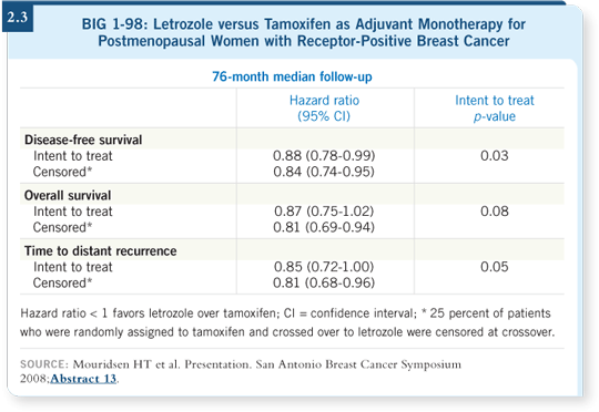 The conventional analysis for all patients as randomly assigned (intent to treat) showed a nonsignificant trend toward better overall survival with up-front letrozole. The alternate analysis, which censored patients when they crossed over from tamoxifen to letrozole, showed a significant effect of letrozole on overall survival (Mouridsen 2008; [2.3]).