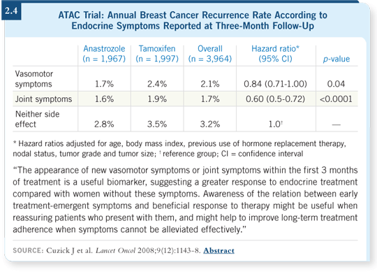 Although more arthralgias were reported in the anastrozole arm and more hot flashes were reported in the tamoxifen arm, the overall numbers of patients reporting symptoms were about the same. Approximately 50 percent of the women in each arm had something to report at three months (Cuzick 2008).