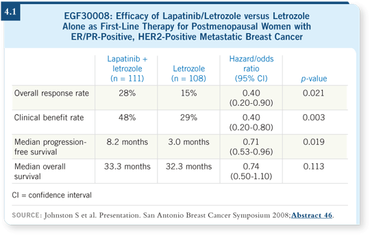 The result was a statistically significant increase in progression-free survival and response rate with lapatinib/letrozole compared to letrozole alone among patients with ER/PR-positive, HER2-positive disease. The overall survival data are immature, with an interesting trend that did not reach statistical significance — a longer data-capture period is required (Johnston 2008; [4.1]).