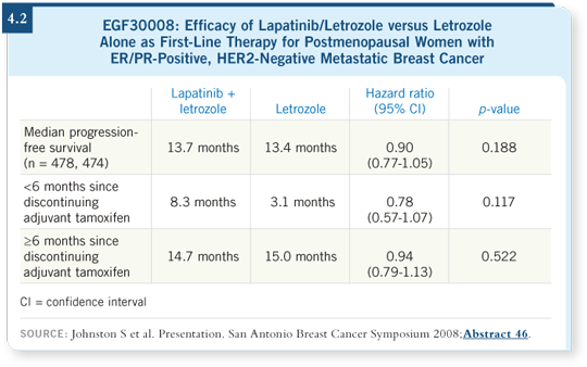 Another interesting twist in the statistical plan stipulated evaluating those patients who experienced disease progression within six months of discontinuing adjuvant tamoxifen. In that portion, which by protocol definition was an endocrine-resistant subpopulation of the patients with HER2-negative disease, a statistically nonsignificant increase in progression-free survival was observed with lapatinib/letrozole (Johnston 2008; [4.2]).