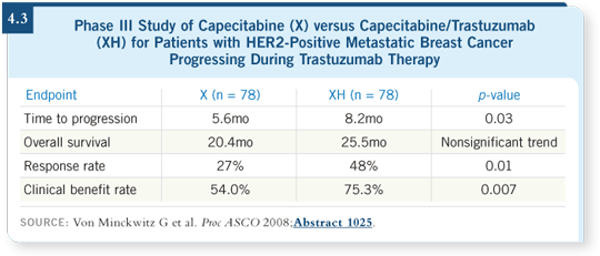 In Europe this was less problematic, and they accomplished the study, which von Minckwitz reported. Sure enough, continuation of trastuzumab with capecitabine was statistically superior compared to capecitabine and discontinuation of trastuzumab in terms of time to disease progression in the salvage second-line setting (Von Minckwitz 2008; [4.3]). This trial supports the overarching concept of prolonged HER2 perturbation in metastatic disease.