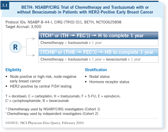 The BETH study is open to almost every patient with HER2-positive disease, even those with node-negative disease. Patients will be randomly assigned to TCH with or without bevacizumab (3.1).